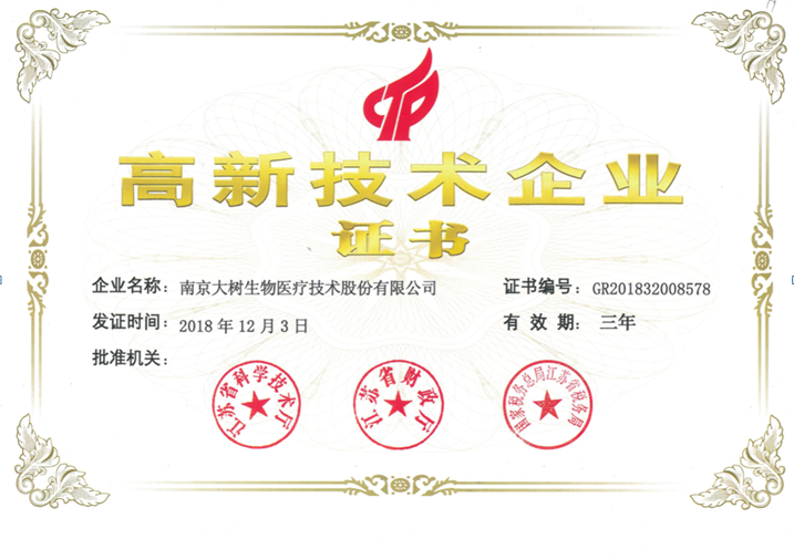 近日,我公司獲得由江蘇省科學(xué)技術(shù)廳、江蘇省財政廳、國家稅務(wù)總局江蘇省稅務(wù)局聯(lián)合頒發(fā)的“高新技術(shù)企業(yè)”證書(shū),由此正式邁入國家高新技術(shù)企業(yè)行列。南京大樹(shù)生物醫療技術(shù)股份有限公司是一家集研發(fā)、生產(chǎn)、銷(xiāo)售為一體的專(zhuān)業(yè)體外診斷試劑醫療器械公司,公司秉承“質(zhì)量為先、信譽(yù)為重、以人為本、精益求精”的質(zhì)量方針,通過(guò)我們的專(zhuān)業(yè)技能和不懈努力竭力為廣大客戶(hù)提供創(chuàng )新優(yōu)質(zhì)的產(chǎn)品及完善的售后服務(wù)!